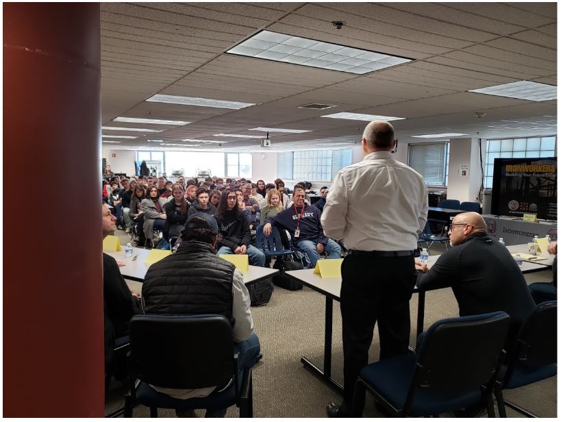 At left, NRMCA’s Doug O’Neill and O&G’s Jim Maher address building officials from Litchfield County, CT and at right, CCPC’s Dominic Di Cenzo speaks to students at Hanford High School about opportunities in the concrete industry.