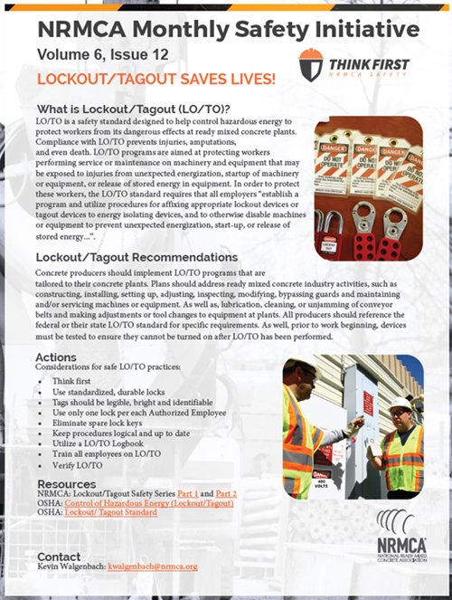 ![]() NRMCA’s Think First monthly safety initiatives feature different industry-specific safety items relevant to seasons, current topics or industry concerns. The initiatives are meant to be shared, used as a training tool, printed, posted or distributed, all of which are encouraged. This month’s issue (seen here) is titled Lockout/Tagout Saves Lives!” Pavement