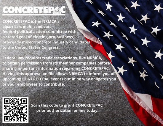 CONCRETEPAC is NRMCA's bipartisan, multi-candidate federal Political Action Committee (PAC) with a stated goal of electing pro-business, pro-ready mixed concrete industry candidates to Congress. Supporting candidates who support the ready mixed concrete industry has never been more critical and, with mid-term elections just around the corner, the ready mixed concrete industry must be prepared to support the races that matter most.