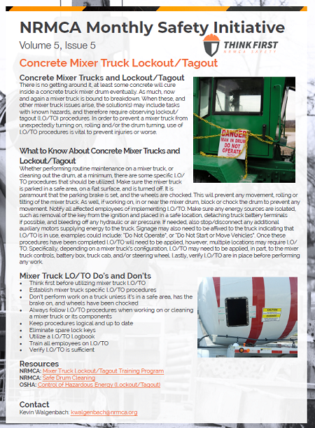 The Environmental Protection Agency (EPA) has launched a new website dedicated to housing information on the agency’s environmental justice (EJ) efforts. The website is in response to an April 2023 Executive Order signed by President Biden to establish “an EJ Clearinghouse to be a public, internet-based, whole-of-government clearinghouse composed of culturally and linguistically appropriate and accessible materials related to environmental justice.” The site comprises publications and guides related to EJ issues, projects, funding opportunities, mapping tools, experts and more. More information, funding, regulations and tools will be added to the website as they become available. Click here to visit the EJ Clearinghouse. For more information, contact Kevin Walgenbach at kwalgenbach@nrmca.org. ![]() NRMCA’s Think First monthly safety initiatives feature different industry-specific safety items relevant to seasons, current topics or industry concerns. The initiatives are meant to be shared, used as a training tool, printed, posted or distributed; all of which are encouraged. This month’s issue, shown here, is titled Concrete Mixer Truck Lockout/Tagout. Click here to view this month’s and all previous Think First issues. For more information, contact Kevin Walgenbach at kwalgenbach@nrmca.org. Calendar