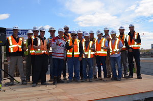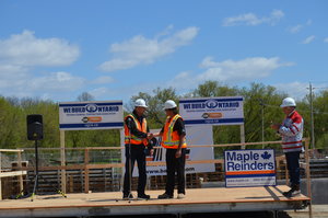 Ball Construction’s President Jason Ball greets Harold Reinders of Maple Reinders Constructors for a joint celebration of Safety Week. MySafeWork's Rob Ellis attended as well as representatives from Maple Reinders Constructors.