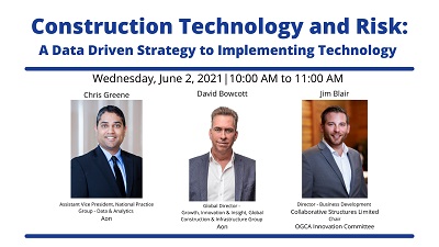 The session will be held Wednesday, June 2 at 10 a.m. (Zoom) and will be hosted by Jim Blair, Director - Business Development, Partner at Collaborative Structures Limited and Chair of the OGCA Innovation Committee. He will be joined by Chris Greene, Assistant Vice President, National Practice Group - Data & Analytics at Aon, and David Bowcott, Global Director - Growth, Innovation & Insight, Global Construction & Infrastructure Group at Aon.