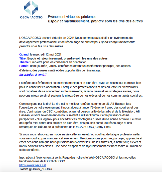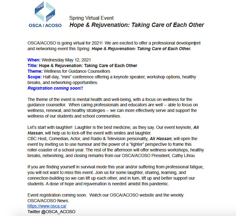 Spring Virtual Event Hope & Rejuvenation: Taking Care of Each Other Print this Article | Send to Colleague _____________________________________________________________________________________ Back to OSCAnews