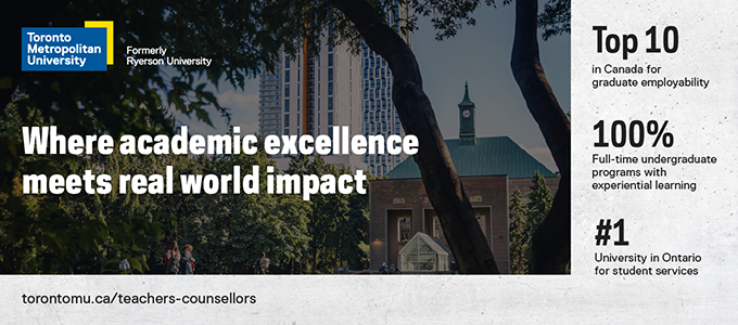 Wednesday, October 15, 10 a.m. - 2 p.m. TMU has been consistently ranked #1 in Ontario for student services. Let us show you how we support your students holistically from admission to graduation. You'll learn how to guide your students through the application process, as well as some resources you can access from a resilience training program designed to teach the 5 Factor Model of Resilience (mindfulness, gratitude, optimism, self-compassion, and grit). This event is open to both teachers and counsellors in high schools, as well as community support facilitators and mentors working with high school students. This event is designed to support you as you support your students. Agenda: 10 a.m. - Arrive at TMU 10:30 a.m. - Networking breakfast with TMU faculty and administration representatives 11 a.m. - Welcome and admissions update 11:15 a.m. - Opening Keynote: Academic Accommodation Support* 12:15 p.m. - Lunch keynote: Resilience Training through Thrive TMU with Dr. Diana Brecher* 1:15 p.m. - Tours of facilities - School of Urban and Regional Planning: Building Healthy Communities - School of Interior Design and Wellness - Psychology and learning the inner workings of the mind *Available to stream virtually
