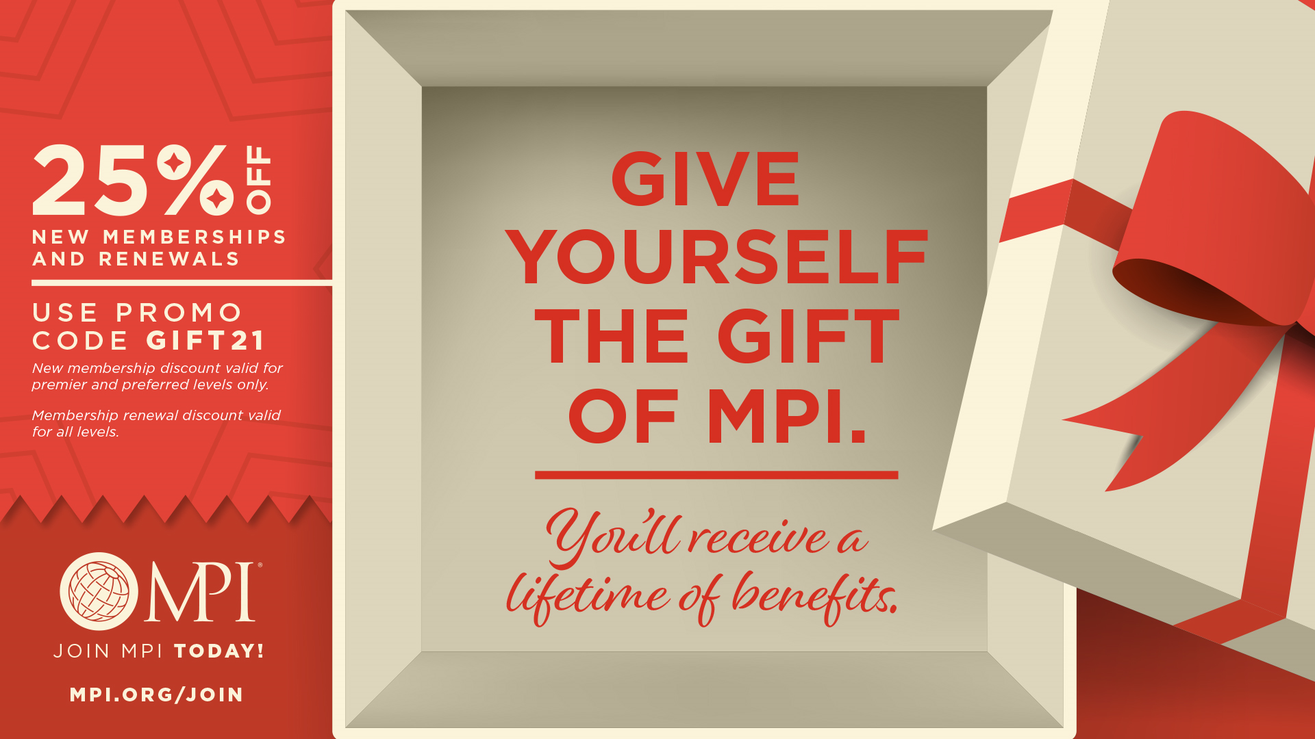 Thanks to MPI, we have a wonderful gift for you to help with your renewal. You can save 25% on your membership fees if you renew before December 31. Just go into your member profile on mpi.org and add in the promo code GIFT21.