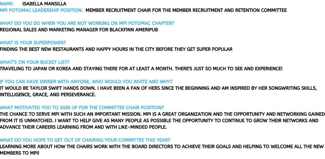 The mission of the Mentorship Program is to empower emerging leaders (mentees) in the global events industry to better serve the MPI Potomac Chapter with leadership excellence by collaborating with experienced leaders (mentors). Dozens of members took part in the program during 2021-2022.