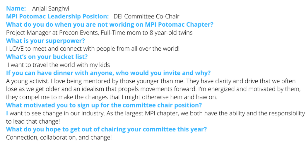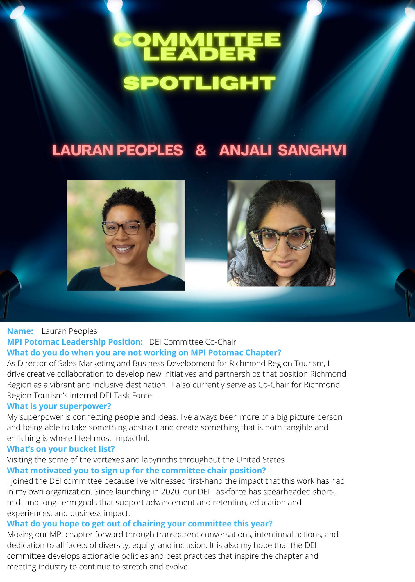 The mission of the Mentorship Program is to empower emerging leaders (mentees) in the global events industry to better serve the MPI Potomac Chapter with leadership excellence by collaborating with experienced leaders (mentors). Dozens of members took part in the program during 2021-2022.