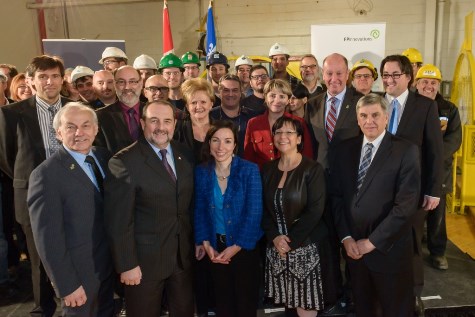 In the photo above are (l-r): (first row) Pierre Lapointe, president and CEO of FPInnovations; the Honorable Denis Lebel, minister of Infrastructure, Communities, and Intergovernmental Affairs and minister of the Economic Development Agency of Canada for the Regions of Quebec; Martine Ouellet, minister of Natural Resources of Québec; Élaine Zakaïb, minister for Industrial Policy and the Banque de développement économique du Québec; and Daniel Archambault, EVP and COO, Industrial Products Division, Kruger. In the second row are: Jean-François Guillot, GM, Kruger’s Trois-Rivières mill; Robert Aubin, MP, Trois-Rivières riding; Noëlla Champagne, member for Champlain; Danielle St-Amand, MNA for Trois-Rivières; Yves Lévesque, mayor, Trois-Rivières; and Pierre Janelle, VP, Manufacturing – Québec, Publication Papers. They are joined by workers from Kruger’s Trois-Rivières mill.