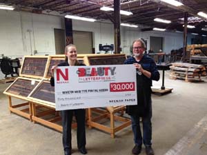 Yesterday, June 4, Neenah Paper, Alpharetta, Ga., USA, celebrated the first 12 months of The Beauty of Letterpress by presenting a $30,000 check to Hamilton Wood Type and Printing Museum in Two Rivers, Wis. The gift included $15,000 raised from the sale of letterpress prints with a matching $15,000 grant from Neenah. The goal of the donations is to help save letterpress history — including 1.5 million pieces of vintage wood type at the museum.