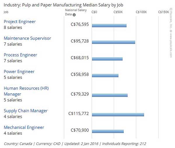 Earlier this week PayScale (Seattle, Wash., USA) published the current average salaries for workers involved in the production of pulp and paper in Canada as of the beginning of this year. The following graph shows some of the median salaries by job: