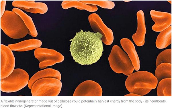 NDTV, New Delhi, India, reports this week that Indian scientists have developed a flexible nanogenerator out of cellulose that could power future implanted biomedical devices by harvesting energy from the human body.