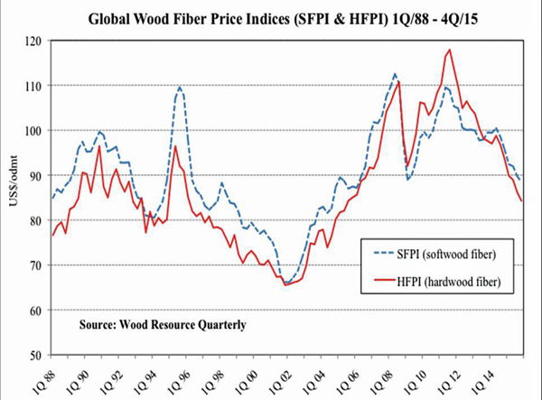 With the exception of the U.S. South and New Zealand, softwood fiber prices were also down throughout the world in the 4Q/15. The declines ranged between 2% and 10% from the previous quarter. The softwood price index (SFPI) was $88.46/odmt, a reduction of 1.4% from the previous quarter.