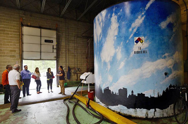 Pictured above: Alex Pike, first from right, of Maine Standard Biofuels, leads a tour of the plant Friday during the 2016 Plants to Products Forum. The entire right side of the picture behind Pike is of a decorated tank with the company's finished product, biodiesel.