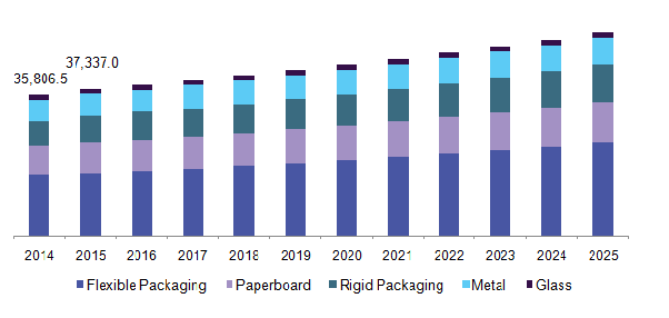Flexible packaging is expected to witness growth at a CAGR of 4.6% from 2016 to 2025. The growing importance of stand up pouch bags as packaging products in the food and beverage industry on account of being contaminant free and certified as safe by the FDA (U.S. Food and Drug Administration) is projected to increase industry demand in the near future.
