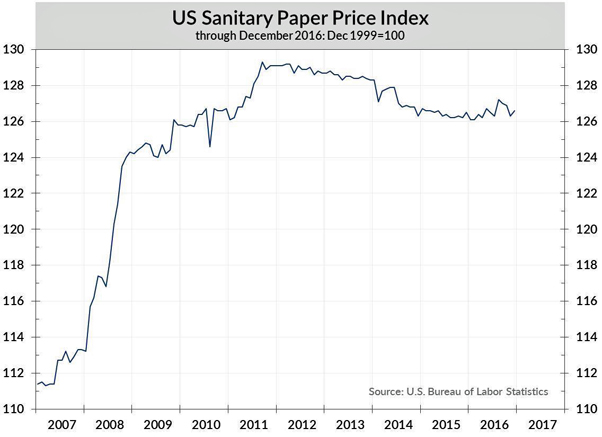 The U.S. sanitary paper producer price index rose modestly in December 2016, following three months of decline. The following graph, based on data by the U.S. Bureau of Labor Statistics, charts the U.S. sanitary paper price index from December 1999 through December 2016.