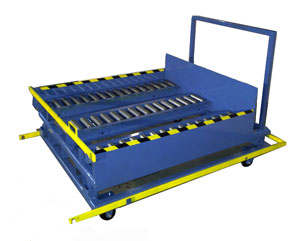 This purpose-built cart is easy to use. Workers roll the cart into position then set the locking/docking bar to secure the cart in position beside an existing conveyor line. Once a pallet has been positioned onto the cart, the pallet retaining bar is lowered into position, thus securing the load for transport. Disengaging the foot switch releases the locking/docking bar and allows the cart and its pallet to be transported elsewhere within the facility to be offloaded onto another conveyor system.