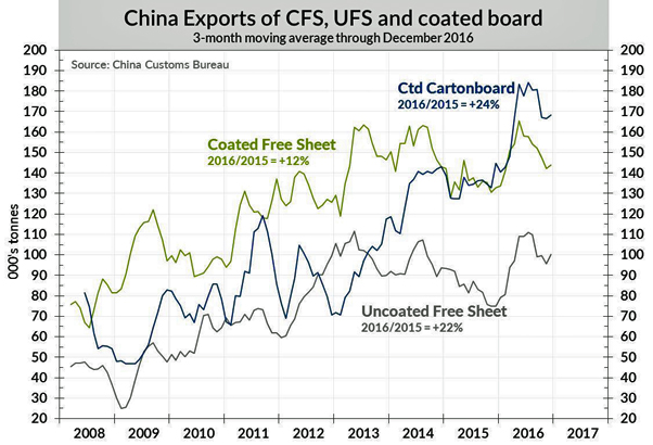 China exported 2 million metric tons of coated board in 2016, up 24% y/y, according to data by the China Customs Bureau. Uncoated free sheet exports were up +22%, while coated paper was +12% in 2016.