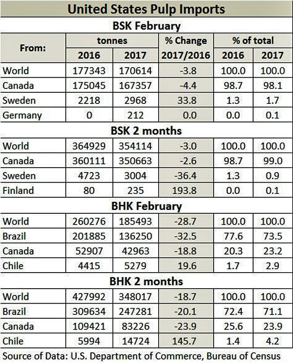 The following table compares 2017 versus 2016 BHK and BSK pulp imports for February and the first two months of each year.
