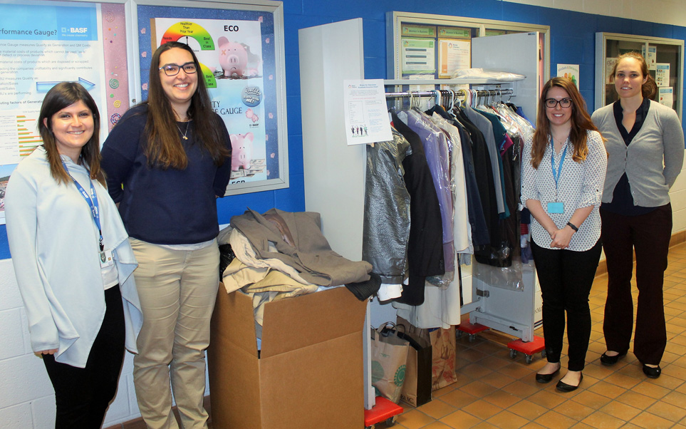 In the photo below, BASF Women in Business members (l-r) Ilona Kulesh, Katie Cook, Amanda Taylor and Dana Orozco help coordinate the clothing drive for Dress for Success.