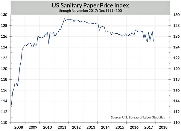 The U.S. sanitary paper producer price index plunged in November 2017 to the second lowest level in more than seven years. The following graph shows the U.S. Sanitary Paper Price Index, based on the U.S. Bureau of Labor Statistics data, from 2008 through November 2017.