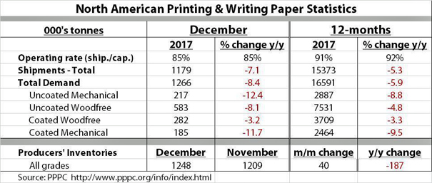 The table below, based on PPPC data, shows North American P&W paper stats for December 2017 and for the entire year of 2017.