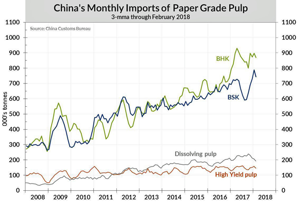 The table below lists China’s BSK and BHK pulp imports for February 2018 and for the first two months of 2018 from key world areas. The following graph charts China’s monthly imports of paper grade pulp (BSK and BHK as well as dissolving pulp) from 2008 through February 2018.