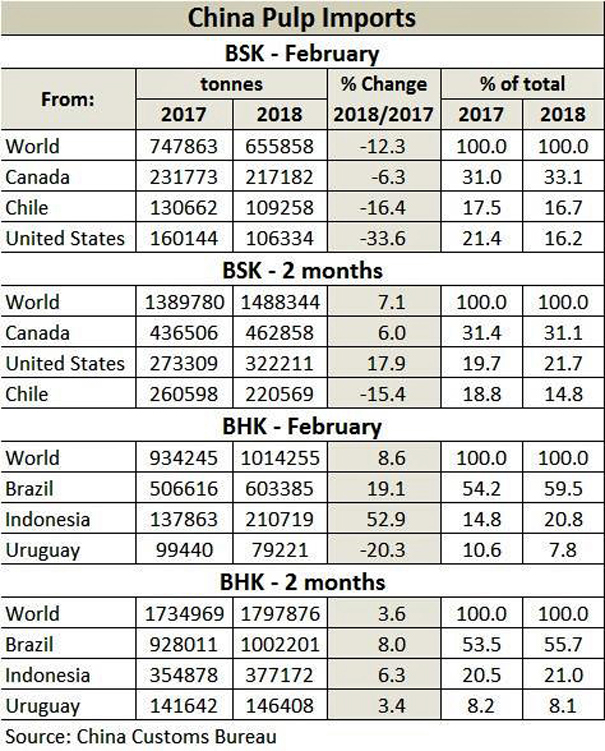 China’s BSK (bleached softwood kraft) pulp imports were up 7.1% y/y through January-February 2018, with imports from Chile down 15.4%., according to data from the China Customs Bureau. China’s February 2018 BHK (bleached hardwood kraft) pulp imports at 1.014 million metric tons was the second highest monthly level ever.
