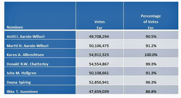 Each of the directors was elected by a majority of the votes cast by shareholders present or represented by proxy at the meeting. The results of the vote are set out in the following table: