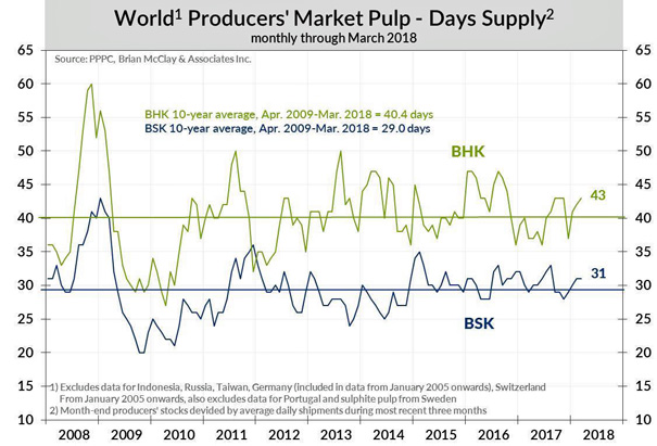 The table below shows World-20 Market pulp shipments for March 2018 and for the first three months of 2018. The following graph shows the days’ supply of market pulp from 2008 through March 2018.