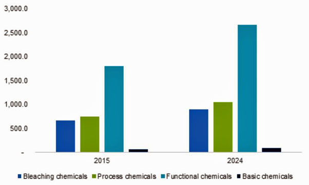 Chemicals used in the paper production are classified as pulp chemicals, process chemicals and functional chemicals. The report also describes global paper treatment chemicals market on the basis of applications based on different paper grades like printing and writing, coated paper, tissue & toweling, packaging & board, newsprint and others. The increasing demand for paper and the consequent rise in paper production have stimulated the pulp and paper chemicals market.