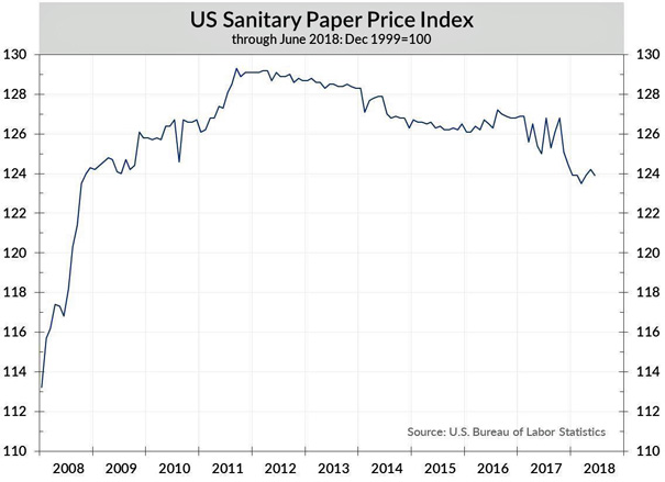The USA sanitary paper producers’ price index was down in June 2018 after two months of marginal improvement. The graph below by the U.S. Bureau of Labor Statistics shows the U.S. Sanitary Paper Price Index from 2008 through June 2018.