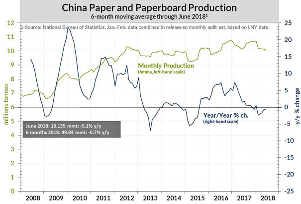The country’s paper and paperboard output was down 0.7% y/y through the first half of 2018.