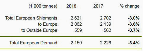 The figures below represent the year-on-year percentage change for total European shipments and total European demand for graphic papers recorded in metric tons for the period of June 2017 - June 2018 as per the European Association of Graphic Paper Producers (Brussles, Belgium). Reports by the association on their Euro-Graph online publication are updated on a monthly basis, usually on the 25th of the month or on the next working day following a weekend or bank holiday.
