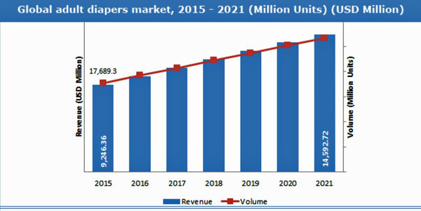 According to Zion Market Research (Pune, India) "Adult Diapers Market (Pad Type, Pants Type, and Flat Type Adult Diapers): Global Industry Perspective, Comprehensive Analysis, and Forecast, 2015 – 2021" report summary, global adult diapers market was valued at $9,246.36 million in 2015 and is expected to reach $14,592.72 million by 2021, growing at a CAGR of 7.50% between 2016 and 2021. In terms of volume, the global adult diapers market stood at 17,689.3 million units in 2015.