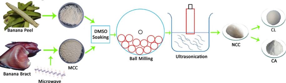 The principal aim of this study is to develop a method for the production of cellulose nanofibers from the banana peel (BP) and banana bract (BB). It's also the aim of this study to produce cellulose-based biopolymers through acetyl and lauroyl modifications. The microwave digestion method and ball milling assisted ultra-sonication method was optimized for sustainable extraction of microcellulosic and nanocellulose fibers.