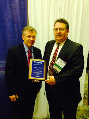 TAPPI's 2014 Engineering Division Leadership and Service Award was presented to Daniel A. Curry of TRC Environmental Corp. (right). The award, sponsored by AMEC, was presented at the PEERS Opening Session this week in Tacoma, Wash., USA. Presenting the award is Don Sorenson of AMEC. AMEC is a market leader in pulp and paper consulting and project implementation. The company has designed and participated in the conception through construction of some of the world’s largest and most technologically advanced integrated mills. Clients include companies in the printing and writing, tissue, packaging, and pulp market sectors.