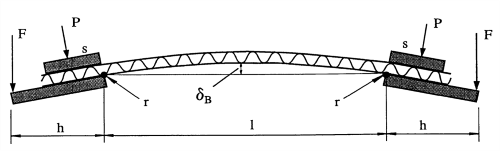 Fig. 1. The four-point test configuration (testing corrugated fiberboard in machine direction). Fig. legends: F = force; h = moment arm; l = free span; δB = deflection; r = rotation axis; P = clamping pressure; s = clamping length.