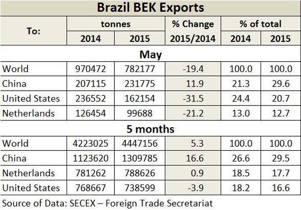 Brazil’s export of bleached eucalyptus kraft (BEK) pulp declined 19% y/y and 10% m/m through May, according to SECEX—Foreign Trade Secretariat, Brazil. This is the lowest monthly total since March 2014. The following table compares Brazil’s exports of BEK pulp for 2014 through the first five month of this year, and the by-year percent of totals for major BEK pulp exporting countries.