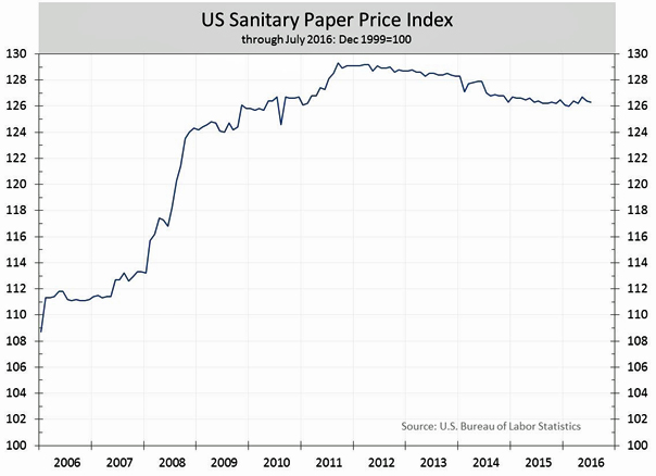 The U.S. sanitary paper producer price index declined in July 2016 for the second straight month. The following graph, based on U.S. Bureau of Labor Statistics, shows the U.S. sanitary price index from 2006 through July 2016.