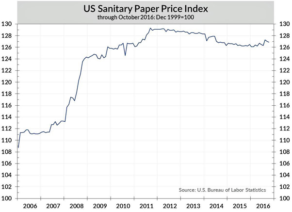 The U.S. sanitary paper producers’ price index declines for the second straight month in October 2016. But the index was still close to a two-year high. The following graph, based on data from the U.S. Bureau of Labor Statistics, charts the index from 2006 through October 2016.
