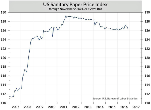 The U.S. sanitary paper producer price index declined for the third straight month in November 2016. The graph below, based on data by the U.S. Bureau of Labor Statistics, charts the index from 2007 through November 2016.