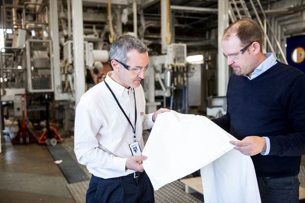 Eduardo Izquierdo, director at FPC, part of the tissue research cluster is checking the paper quality together with Karl-Johan Tolfsson, manager of Valmet Tissue Technology Center