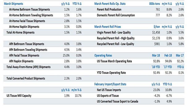 March US tissue stats continued to show a consistent and positive growth trend. Shipments for converted products remained strong, up 2.3 percent y/y (2.0 percent YTD), with particularly strong numbers from the Away-From-Home segment (+4.4 percent y/y, +3.5 percent YTD), along with continued steady growth from the At-Home segment (+1.5 percent y/y, +1.5 percent YTD).