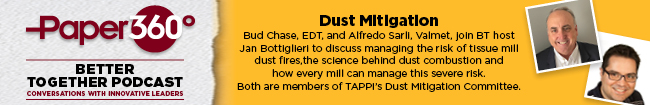 In the latest episode of TAPPI’s Better Together podcast, host and Paper360° Magazine Editorial Director Jan Bottiglieri, speaks with Bud Chase and Alfredo Sarli, members of the TAPPI Tissue Division Dust Mitigation Committee. This growing, active group of professionals meets to discuss a critical issue: managing the risk of tissue mill dust fires. Listeners will learn more about the science behind dust combustion; how vendors and manufacturers are working together to identify new mitigation goals and techniques; the potential risk involved; and what top things our experts feel every tissue mill must do to manage this risk.