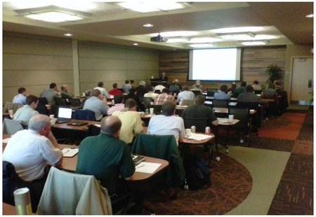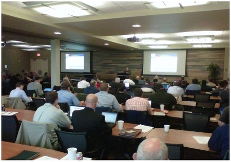 In the first photo below, Robert Zeller of Thermal Coatings International gives a technical talk on spray metal coatings for yankee dryers. In the second photo, Neil Arafat of Enerquin gives a case history on a recent yankee hood upgrade that improved thermal efficiency and drying rate. The presentation was made to both the YDSRC and the Lakes States Energy Forum.