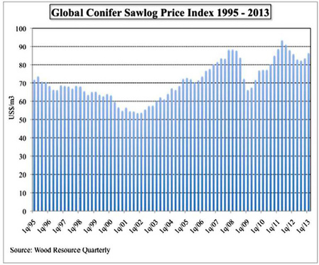 The following are excerpted sections from current issues of Wood Resources Quarterly (WRQ), which is published by Wood Resources International, Seattle, Wash., USA. Global Timber Markets Sawlog prices in the 1Q/13 were up in practically all regions covered by the WRQ, but they were still generally lower than they were in the 1Q/12. The biggest increases from the previous quarter occurred in the Western U.S., Latvia, Finland, and Sweden. The Global Sawlog Price Index (GSPI) was up 2.4% to $86.33/cubic meter from the 4Q/12, the biggest quarter-to-quarter increase since early 2011.