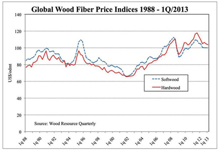 Hardwood fiber prices were down in Asia and Eastern Canada in the 1Q, while they were slightly higher in Europe and Latin America compared with the 4Q/12. The Hardwood Wood Fiber Price Index (HFPI) fell by 1.1% to $103.66/odmt in the 1Q/13, and was 12% below the all-time high in the 3Q/11.