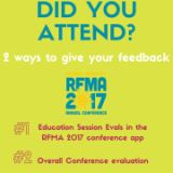 1. Education Session Evaluations in the RFMA 2017 conference app 2. Overall Conference Evaluation Your feedback matters to RFMA so make sure to complete both your education session evaluations and overall conference evaluation. Save the Date for RFMA 2018! Join us in Phoenix for RFMA 2018, March 4-6, 2018.