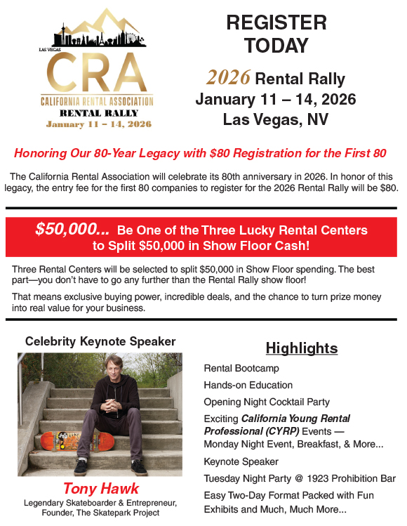 Contact Jeff, Katie, and Connie with questions or ideas for the continued growth of our association. Visit the CRA website at www.calrental.org and see the opportunities available to help sustain and grow your business. Stay engaged with CRA!