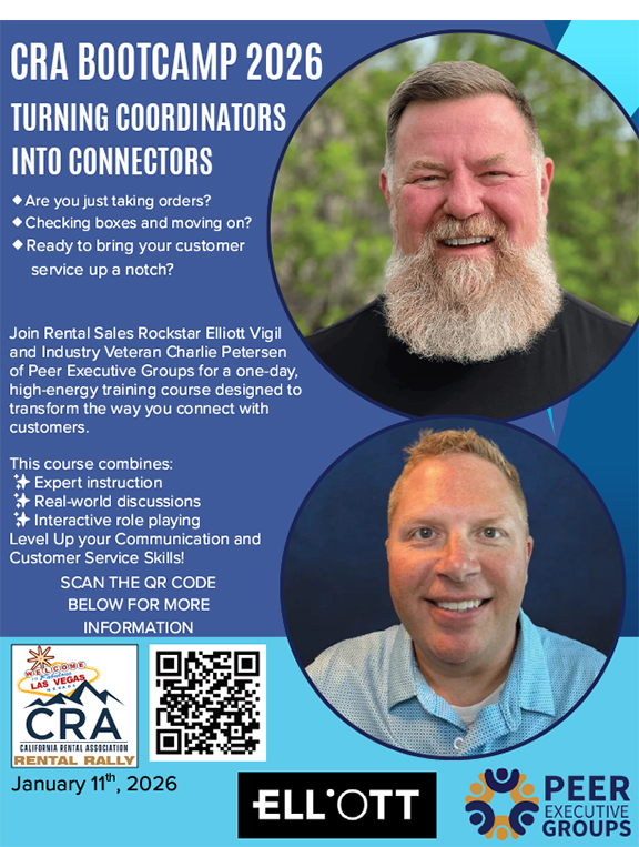 Contact Jeff, Katie, and Connie with questions or ideas for the continued growth of our association. Visit the CRA website at www.calrental.org and see the opportunities available to help sustain and grow your business. Stay engaged with CRA!
